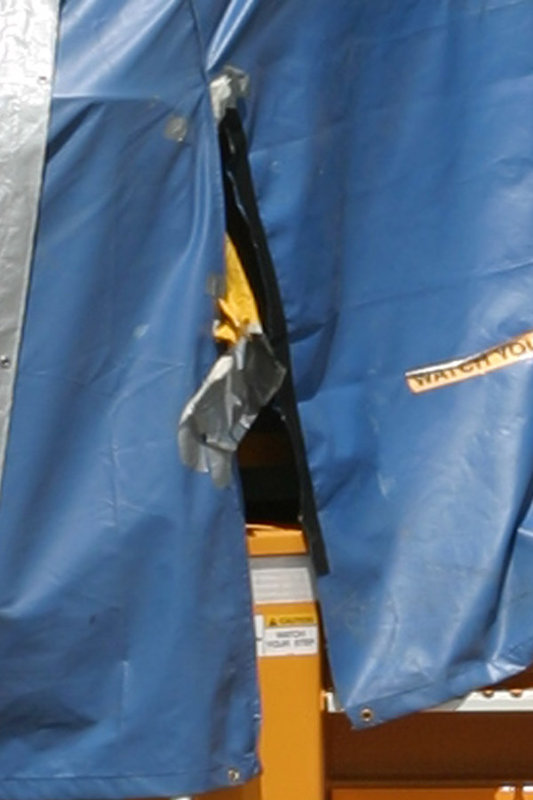 Is that a stripe I see through the break in the tarp? The unit's guardians clearly noticed fans trying to photograph the gap, and plugged it with cardboard later in the day.